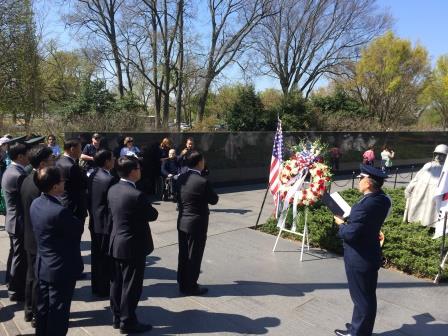 8) South Korean dignitaries laying a wreath at the Korean War Memorial.