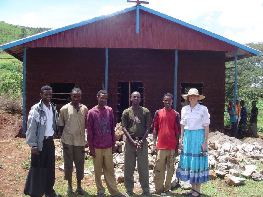A total of over $26,000 was sent with us for His work, and a stewardship record has already been sent to those who have given. Also, some of you sent seeds, bracelets, clothes, ladies scarves, bookmarkers, protein bars, eyeglasses, and vitamins. All of these were distributed personally by us to the people who will be using them, or else to the church leaders closest to the people who will use them. We have tried to remove as many layers as possible of “bureaucracy” between the giver and the receiver. Many of the seeds (such as okra, zucchini, and yellow squash) had never been seen before, but the Ethiopians are excited to try something new. The bracelets, scarves, and bookmarkers were given to those attending our teaching sessions, as a reminder of the subject matter. The protein bars were given to 3 evangelists who work hard, but have no physical reserve. One of these evangelists commented to me, “I couldn’t understand why I got so weak the last time I was sick.” In the past, these protein bars have made a tremendous difference in their physical strength within just a few short months. There are no protein bars in Ethiopia. The vitamins were given to rural church leaders to distribute to pregnant women who also have at least 3 children at home. And the eyeglasses were divided between the Alaba and Burji districts, for the leaders to distribute after testing the people. Left: Women showing off their new bracelets after attending a women’s class at 5:00am! Right: We took about 400 pairs of eyeglasses, and didn’t have to pay any customs fee! One of the greatest joys of the trip was the opportunity to visit the first church “we” have built in the rural Alaba district. (When I say “we,” I mean you, us, the Alaba believers, and our Lord Jesus.) In report #6 of our last trip, we shared with you how God has put in our hearts the desire to assist the believers in rural Alaba in erecting their church buildings. Each building costs $2,250, which is far beyond the reach of these people. The persecution is so strong that they quickly become impoverished the moment they name our Lord Jesus as their Saviour. But they are eager to work. So we are gathering funds to buy the materials, and they are doing the labor. There are 9 churches needing to be built. As I write this, the church leaders are securing the legal status of the lands. The first church completed is called Galeo. It sits on a mountainside overlooking the Alaba Valley. As we approached it, the leaders said, “Look, you can see it already!” And sure enough, there it was, glimmering in the sunshine, its cross clearly evident, proclaiming to all, “This Valley belongs to our Lord Jesus!” What a joyous sight! We drove in a Land Cruiser as far as we could, then we got out and hiked up the mountainside. We paused every few hundred yards, still adjusting to the high altitude, but we eventually made it. The building was a simple rectangle, with space for several windows and two doors. The windows and doors will be of solid wood. There is no electricity; the floor is mud. The roof is corrugated tin. The walls are made from timbers manually hauled from a nearby forest and mud/straw “stucco.” The foundation is from purchased concrete, sand pulled out of the river, and stones obtained from the fields. One of the leaders donated the land. As you can see, this church stands as an example of the Lord’s people working together for His glory and His witness. After a hike, we arrived at Galeo church on the mountainside overlooking the Alaba Valley. We paused in the building for a picture with Girma (Memory Program coordinator), the Galeo church leaders, and BeckyLynn.