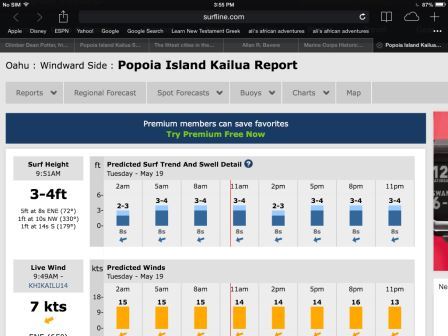 Tuesday, May 19 8:00 PM Being an incurable tinkerpreneur, I've dabbled in a lot of different things in my 62 years, but unreasonable risk-taking has never appealed to me. That's why I have very mixed feelings as I contemplate the death of wingsuiter/daredevil Dean Trotter yesterday in Yosemite. Someone has said that Dean lived more in his 43 years than most men live in 100 years. That he was a risk-taker, nobody would doubt. I'm all for pushing oneself to one's limits. Within limits. We all take risks on a daily basis. (You say, "I don't take risks!" Do you drive a motor vehicle?) I've never BASE-jumped or sky dived, but for 15 years I rode my horses full out over hill and dale. A few unplanned dismounts at 25 miles per hour, and you're likely to realize it's time for a change of avocations. Yet there is a certain part of me that respects Dean Trotter and anyone who dies doing what they really love. What I don't understand is their craving for danger. (Heard of Mustang Wanted?) In one of his final interviews, Dean said that "every death has a lesson." The lessons for me? I will take risks, but not for their own sake. And I will continue to enjoy flying -- in an airplane. 5:05 PM So what to do on Oahu besides surf?