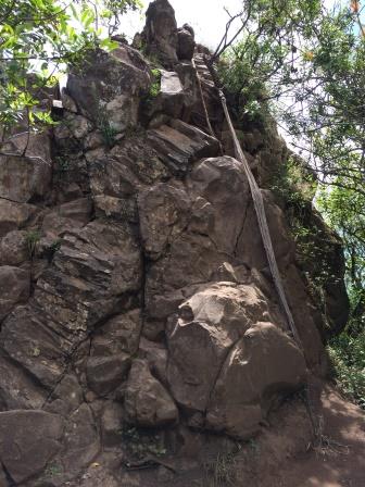 8) The Olomana Trail is sometimes assisted by unmaintained ropes and you can't automatically count on their condition. You can't see it in this picture, but there are drop-offs of several hundred feet on both sides of this rock face.