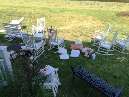 3) Got up early to scrub the chairs, which are now drying under a very hot sun. And to think we have to get up more bales this afternoon. (Oh boy, I need counseling now.)
