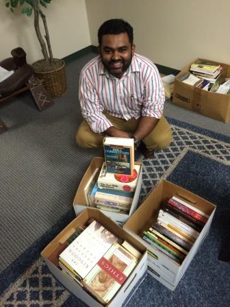 2) Here I am giving away boxes of books to Moncy Mammen to take with him back to India, where he serves as principal of the Hebron International School.