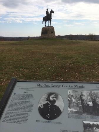 15) Eventually you arrive at Meade's statue along Cemetery Ridge. (It was an odd war: Meade's sister married a planter from Mississippi and her son died at Fredericksburg fighting for the Confederacy.) The statue does a good job of portraying Meade's balding head and pouchy eyes that always seemed to give an air of melancholy. At Gettysburg, Meade was at his best. Sadly, his reputation took a considerable nose-dive when he let Lee escape back into Virginia. Lee won the race to Williamsport, and the war dragged on and on.
