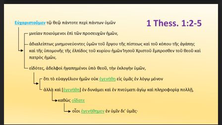 7:20 AM Good Saturday morning, readers! Next Tuesday in Greek 4, we'll be discussing 1 Thess. 1:2-5. This paragraph underlines Paul's entire approach to missions. When the lost are confronted squarely with what Christ has done for them, a response can be expected. Paul therefore sees the evangelistic preaching of the "word" as fundamentally tied to a subsequent changed life on the part of the receiver. He was certainly not afraid to mention the consequences of God's election. We tend to view election as something in the past. Paul, however, is not afraid to point out the present evidence of a past election. An attitude of humble obedience, selfless sacrifice, and unshakable hope characterize both church and evangelist when they are at their best. This colon (which is one long sentence in Greek) can be outlined as follows.