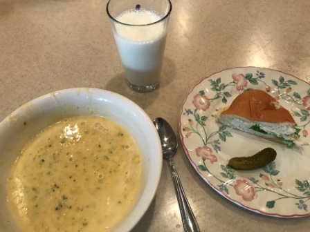 I'm home now devouring some cream of broccoli soup, a fresh chicken salad sandwich with lettuce, and a glorious sweet pickle!