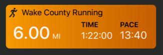 I also managed two workouts at the Y in Wake Forest as well as a 6 mile run at a local park there.