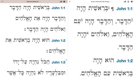 Never has fescue looked greener! 7:04 AM Please join us for chapel today at 10:30. President Danny Akin will be our speaker. It will be a wonderful encouragement to us all I am sure. Tuesday, May 5 11:22 AM Had a wonderful Zoom conversation this morning with a good friend who lives in Israel and teaches Greek and Hebrew at a Bible College there. He once studied under me before getting his Ph.D. in Hebrew at one of our sister seminaries. We had a blast chatting about Greek and Hebrew. Should you need some entertainment today, take a look at John 1:1 in both the Delitzsch translation (left) and Modern Hebrew (right).