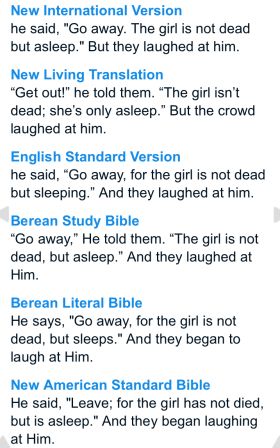 Those 3 underscored letters pack meaning. (The little kat is an intensifying prepositional prefix. Kat means "down.") To "laugh" is one thing. To "laugh down" is another thing. The verse is Matt. 9:24. You recall the setting. The rabbi of the local synagogue has asked Jesus to heal his daughter. Jesus arrives at the man's home and sees noisy crowds and hears funeral music. He says, "Get them out, for the little girl isn't dead. She's only sleeping." What happened next? See the following versions: