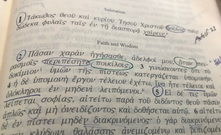 Thursday, May 7 10:48 AM "Always pay attention to the small words." Good advice for anyone doing exegesis. I've often told my students to do this very thing. Well, let's try and apply this to James 1, the passage I was studying this morning. Notice, first of all, the word "when." James doesn't say "If trials come." He says, "When trials come." "When" stands out. Trials are inevitable. They are unavoidable. They are inescapable. They are inexorable. Don't try to ignore them. Don't try to escape them. Don't try to deny them. Secondly, look at that word "various." James says we face "various kinds of trials." The Greek word is poikilois.