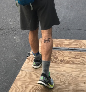 4) In addition, your age goes on your right calf. Without question the purpose of this number is to humiliate us seasoned citizens. I actually requested that they write "30" on my leg but they insisted on scribbling my "real" age. Seriously, though, there is madness to their method. If you have a strong competitive spirit, you tend to go after the athletes in your own age group. Oddly enough, I don't think I saw anyone older than me on the course, but that's probably because all the "old guys" had long since finished the race.
