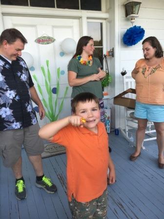 If the latter, then welcome to Grassmann's Law! Afterwards I got up hay with Nate and then pigged out on Mexican cuisine. Now it's time to settle in with Free As a Running Fox. Bis Morgen.... 7:28 AM Good morning everyone! First order of business: Report on the-best-birthday-party-I've-ever-had-in-my-65-years-of-living. It all started when two of my sons-in-law "kidnapped" me and drove me to the cemetery to visit Becky's grave. We prayed, read Scripture, and reminisced. (Okay, one of us also bawled like a baby.) Then it was back to the farm, which by now had been magically transformed into a Hawaiian beach scene with slack-key guitar music, waving palm trees, tiki torches, and leis for the bunch. I was completely taken by surprise. I felt like I was at a hukilau!