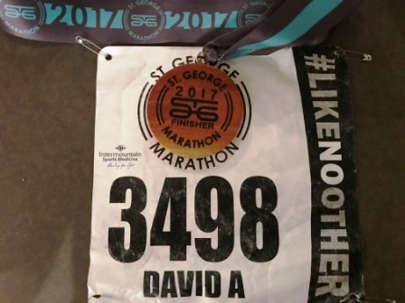 I drove 26 miles out of town to a little bump in the road called Central. Here the race organizers were busy setting up the starting line as well as the flags that would be flying the next morning. There were runners from 44 states and 16 foreign countries and the flags of each were proudly on display. The St. George Marathon is a point to point race. You're bused 26.2 miles to the starting line and then you have to run back into town. I began my drive back into St. George along the route I would run the next morning. As I approached the dreaded Veyo Hill I took a big gulp. There's no denying it: this "downhill" course had some pretty hefty ascents, three of them in fact. "Remember that tomorrow, Dave," I told myself. Then I checked into my Airbnb and tried to get some zzzs but a loud party next door kept me up until after midnight.